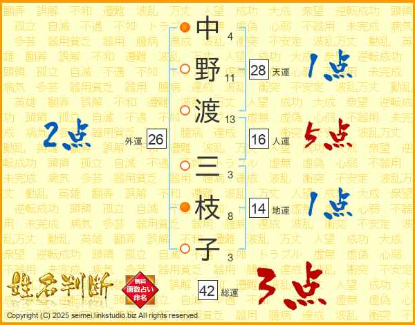 中(4画)野(11画)渡(13画) 三(3画)枝(8画)子(3画)