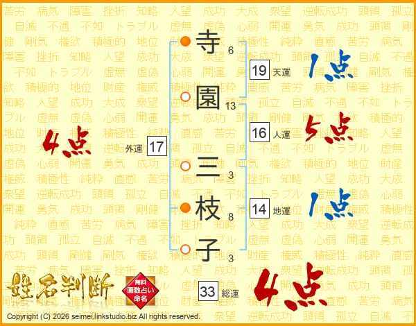 寺(6画)園(13画) 三(3画)枝(8画)子(3画)