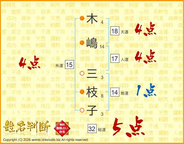 木(4画)嶋(14画) 三(3画)枝(8画)子(3画)