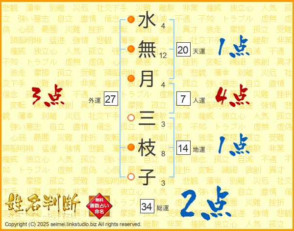 水(4画)無(12画)月(4画) 三(3画)枝(8画)子(3画)