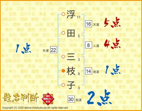 浮(11画)田(5画) 三(3画)枝(8画)子(3画)