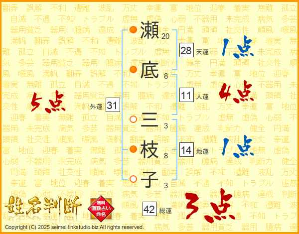 瀬(20画)底(8画) 三(3画)枝(8画)子(3画)