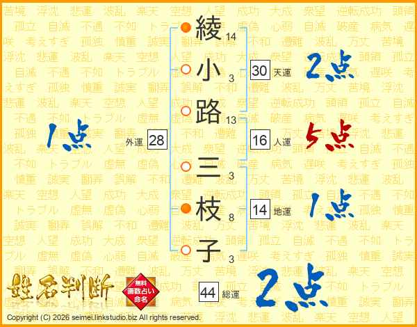 綾(14画)小(3画)路(13画) 三(3画)枝(8画)子(3画)