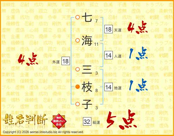 生活面を象徴する運勢です。外部から受ける影響力を表し、結婚運、家庭運や職場、環境への順応性を表します。総運から人運を引いた画数。姓や名が1文字の場合を除く。