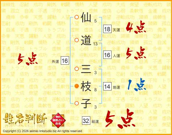 仙(5画)道(13画) 三(3画)枝(8画)子(3画)