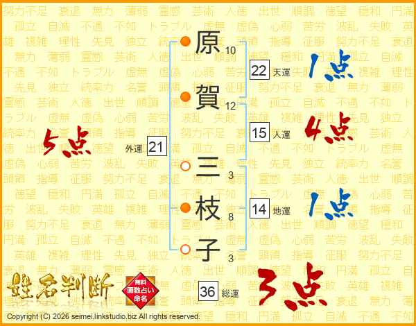 原(10画)賀(12画) 三(3画)枝(8画)子(3画)