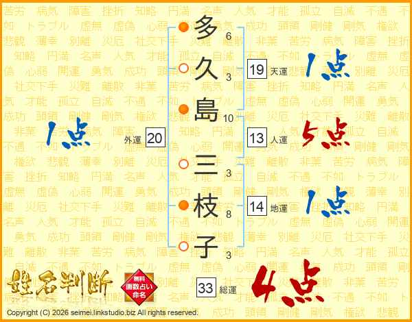 多(6画)久(3画)島(10画) 三(3画)枝(8画)子(3画)