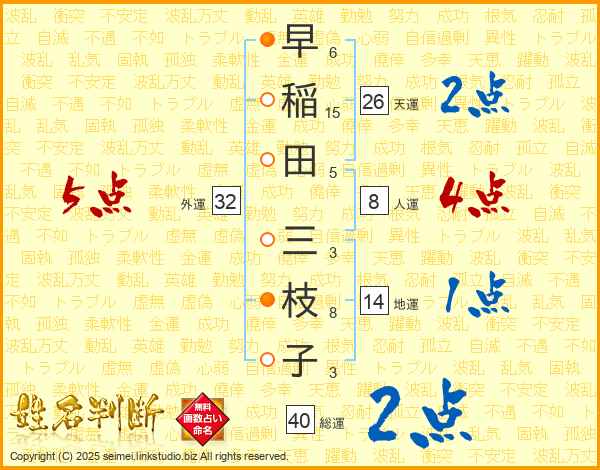 早(6画)稲(15画)田(5画) 三(3画)枝(8画)子(3画)