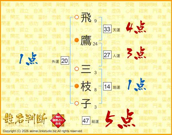飛(9画)鷹(24画) 三(3画)枝(8画)子(3画)