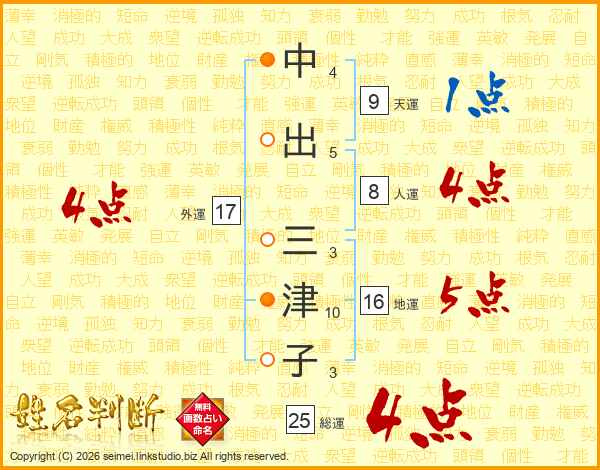 中(4画)出(5画) 三(3画)津(10画)子(3画)