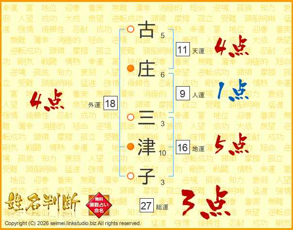 古(5画)庄(6画) 三(3画)津(10画)子(3画)
