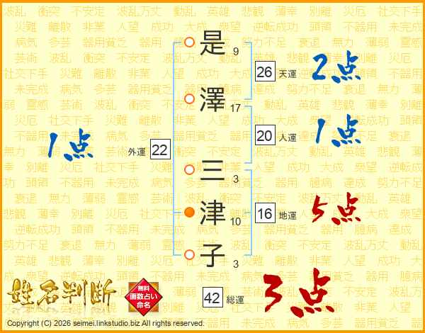 是(9画)澤(17画) 三(3画)津(10画)子(3画)
