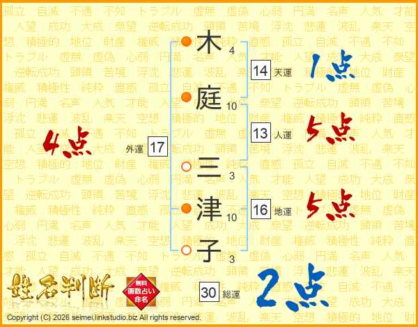 木(4画)庭(10画) 三(3画)津(10画)子(3画)