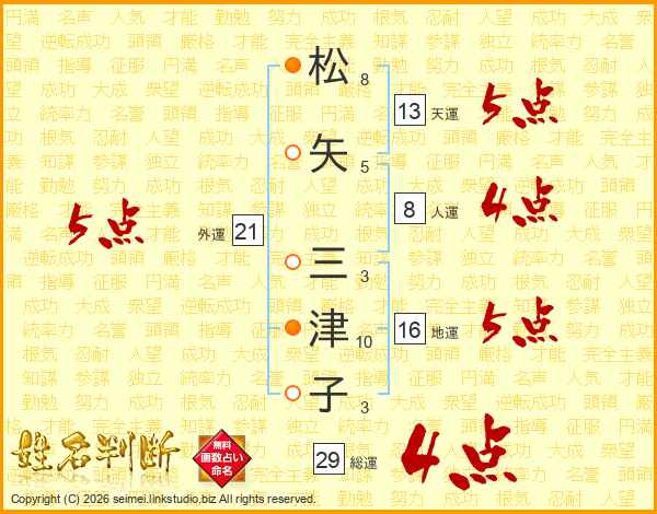 松(8画)矢(5画) 三(3画)津(10画)子(3画)