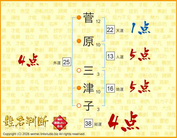 菅原三津子さんの総運は38画の4点!