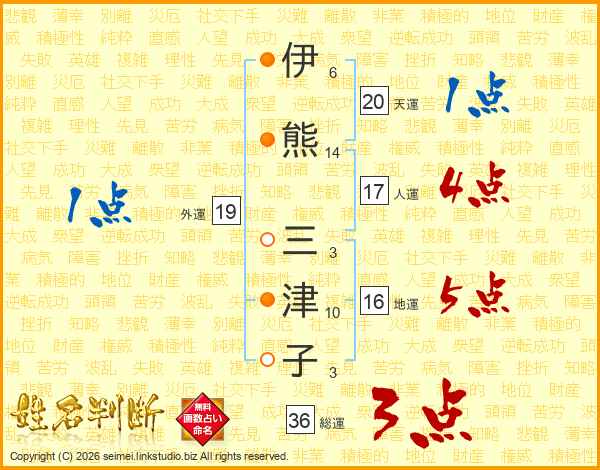 伊(6画)熊(14画) 三(3画)津(10画)子(3画)