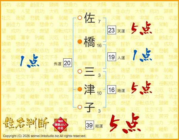 佐(7画)橋(16画) 三(3画)津(10画)子(3画)