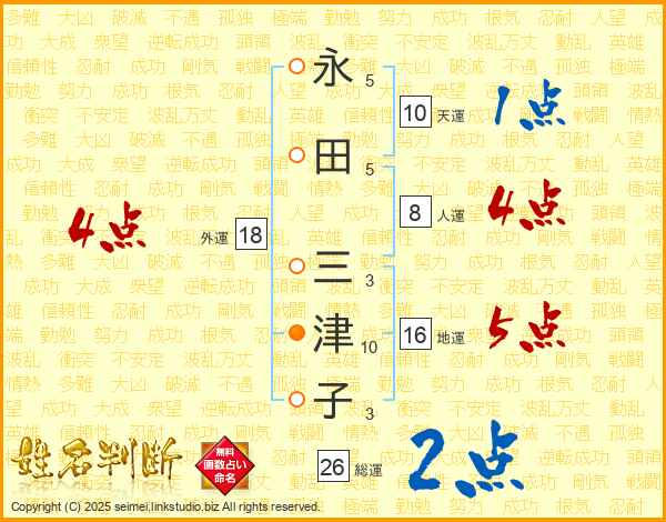 永(5画)田(5画) 三(3画)津(10画)子(3画)