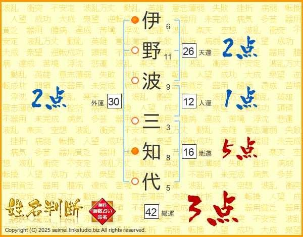伊(6画)野(11画)波(9画) 三(3画)知(8画)代(5画)