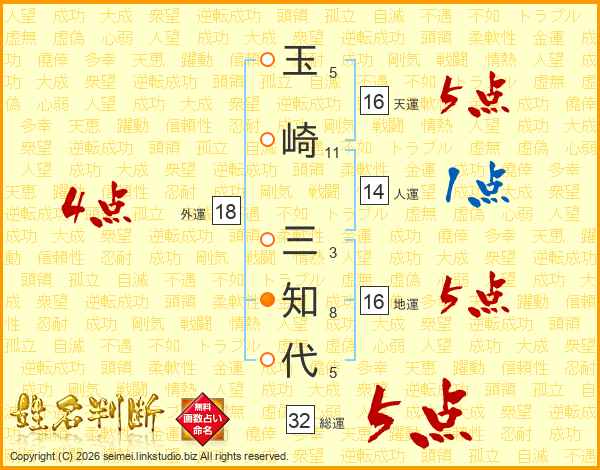玉(5画)崎(11画) 三(3画)知(8画)代(5画)