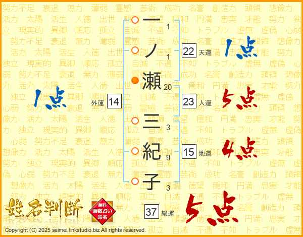 一ノ瀬三紀子さんの総運は37画の5点!