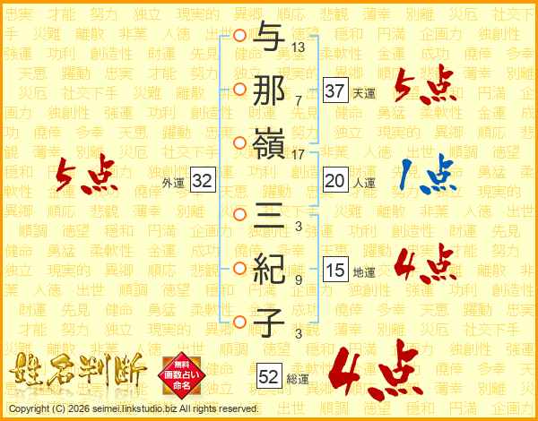 与(13画)那(7画)嶺(17画) 三(3画)紀(9画)子(3画)