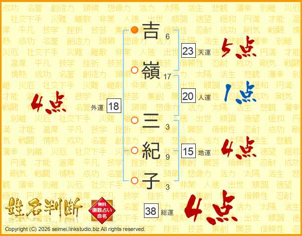 吉(6画)嶺(17画) 三(3画)紀(9画)子(3画)