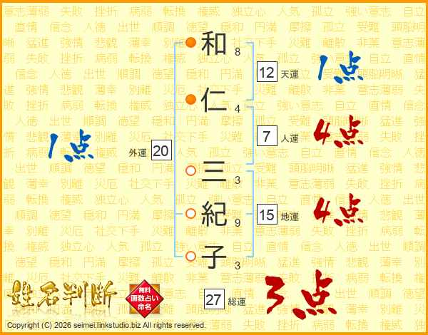 和(8画)仁(4画) 三(3画)紀(9画)子(3画)