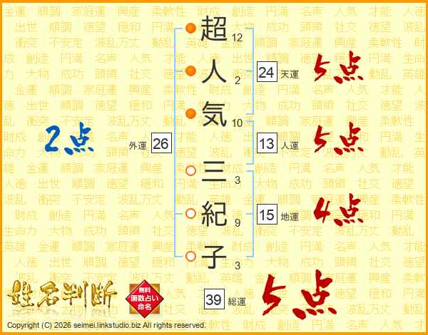 超人気三紀子さんの総運は39画の5点!