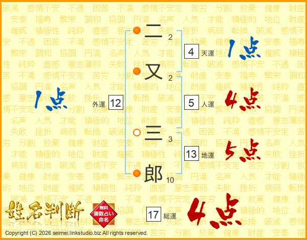 二又三郎さんの総運は17画の4点!