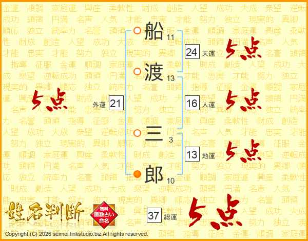 あなたの人生を表す1番重要な運勢です。生涯を通じて影響する総合運となり、主に50歳以降の晩年期に影響を及ぼします。苗字と名前の合計画数。