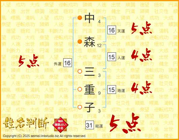 中(4画)森(12画) 三(3画)重(9画)子(3画)