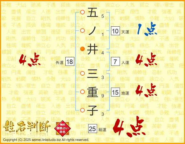 五(5画)ノ(1画)井(4画) 三(3画)重(9画)子(3画)