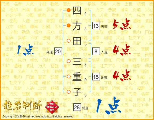 生活面を象徴する運勢です。外部から受ける影響力を表し、結婚運、家庭運や職場、環境への順応性を表します。総運から人運を引いた画数。姓や名が1文字の場合を除く。