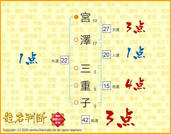 宮(10画)澤(17画) 三(3画)重(9画)子(3画)