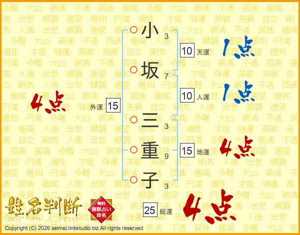 小坂三重子さんの総運は25画の4点!