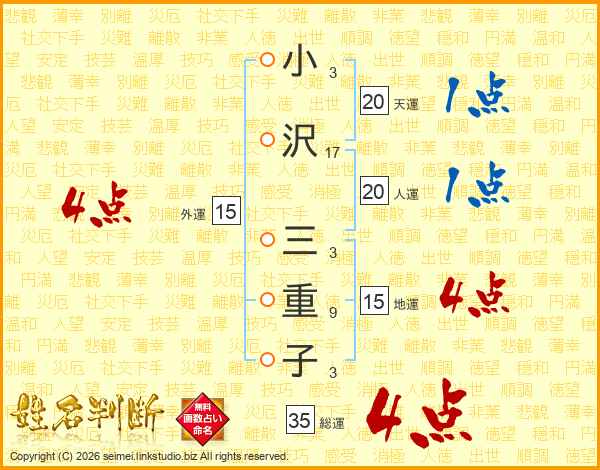 小(3画)沢(17画) 三(3画)重(9画)子(3画)
