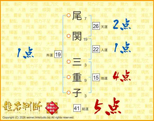 尾(7画)関(19画) 三(3画)重(9画)子(3画)