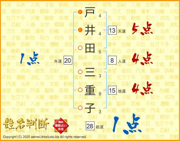 戸(4画)井(4画)田(5画) 三(3画)重(9画)子(3画)