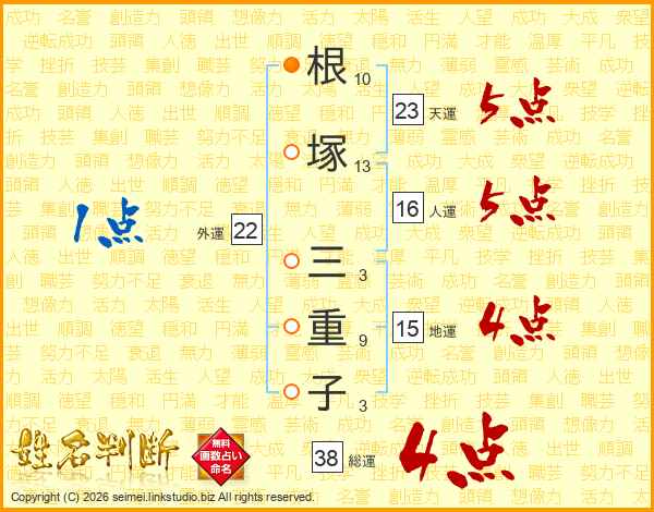 根(10画)塚(13画) 三(3画)重(9画)子(3画)