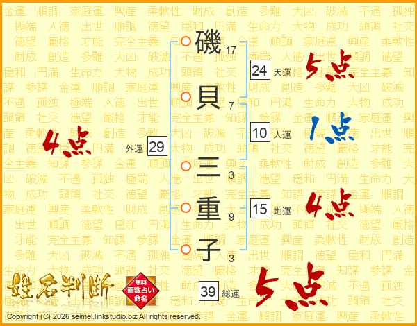磯(17画)貝(7画) 三(3画)重(9画)子(3画)