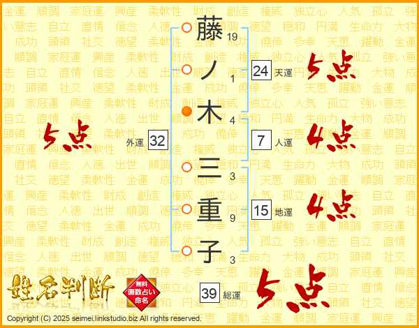 藤(19画)ノ(1画)木(4画) 三(3画)重(9画)子(3画)