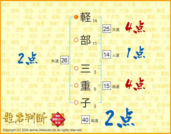 軽(14画)部(11画) 三(3画)重(9画)子(3画)