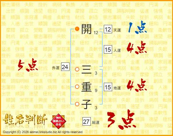生活面を象徴する運勢です。外部から受ける影響力を表し、結婚運、家庭運や職場、環境への順応性を表します。総運から人運を引いた画数。姓や名が1文字の場合を除く。
