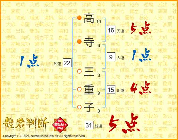 高(10画)寺(6画) 三(3画)重(9画)子(3画)