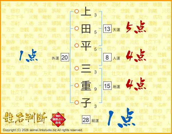 上(3画)田(5画)平(5画) 三(3画)重(9画)子(3画)