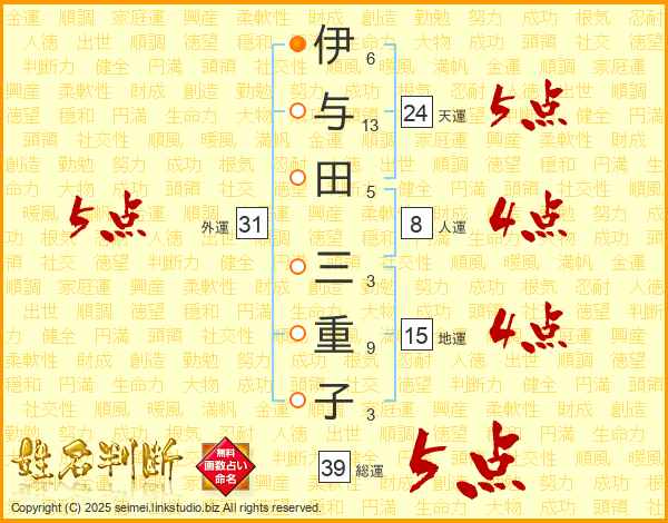 伊(6画)与(13画)田(5画) 三(3画)重(9画)子(3画)