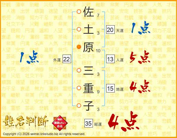 佐(7画)土(3画)原(10画) 三(3画)重(9画)子(3画)