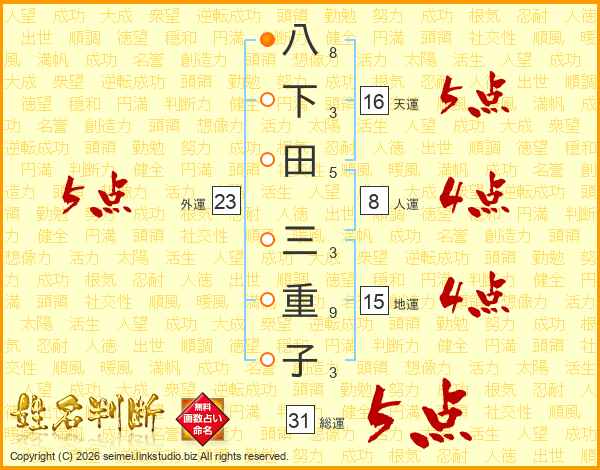 八下田三重子さんの総運は31画の5点!