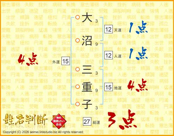 大(3画)沼(9画) 三(3画)重(9画)子(3画)